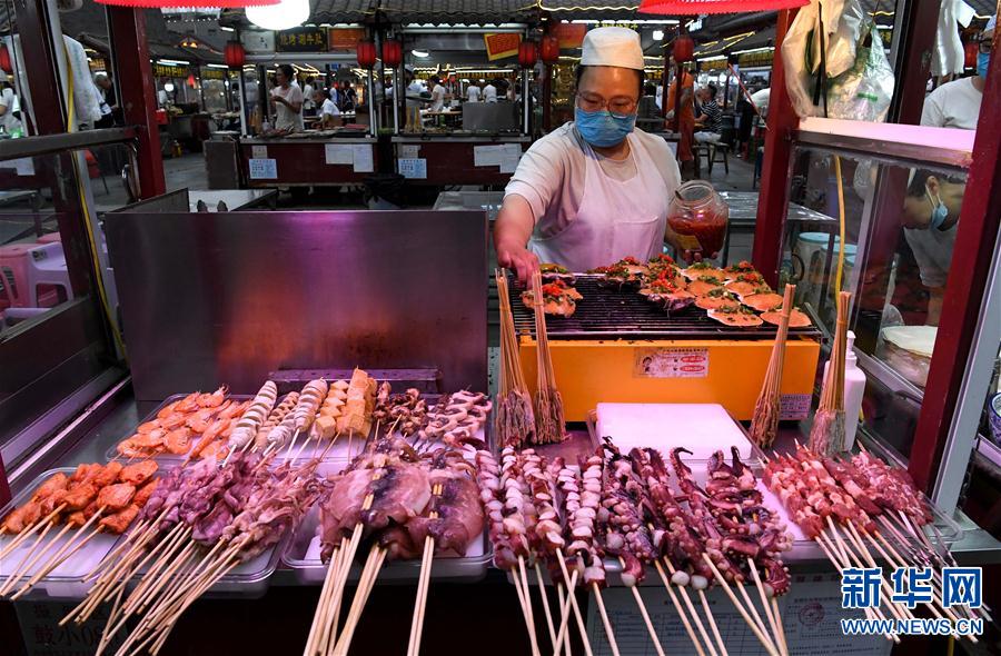 6月2日,在河南省开封市鼓楼夜市,食客从烧烤摊位前经过。新华社记者 李安 摄