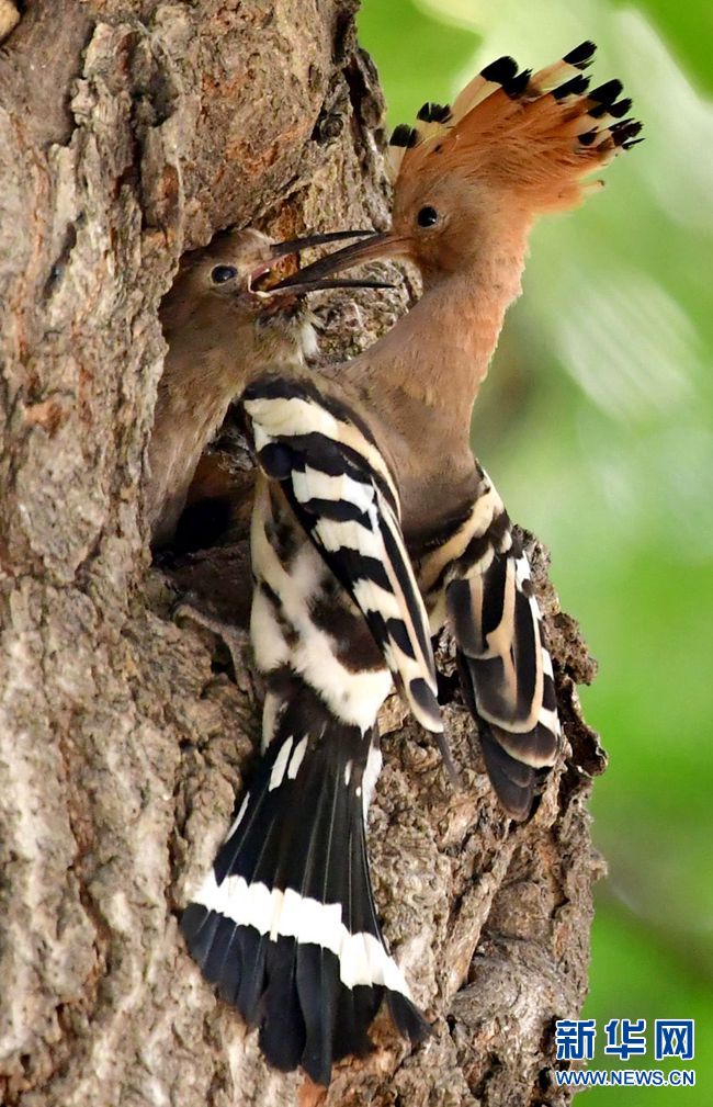 6月30日,在洛阳市国家牡丹园内,一对戴胜鸟“父母”轮番给树洞里的鸟宝宝喂食。