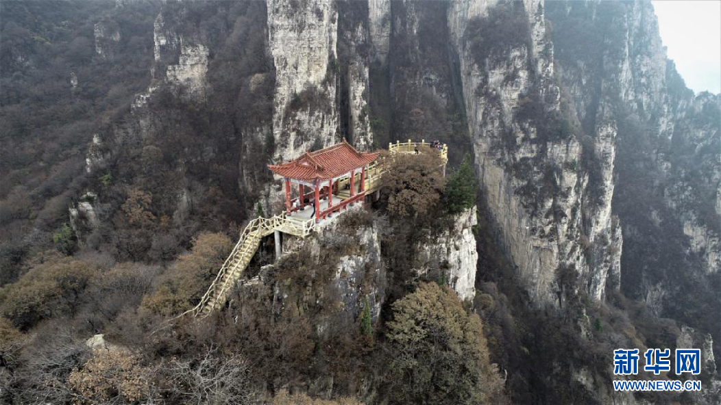 高耸的山峰下,层林尽染。新华网 发(陈春明 摄)