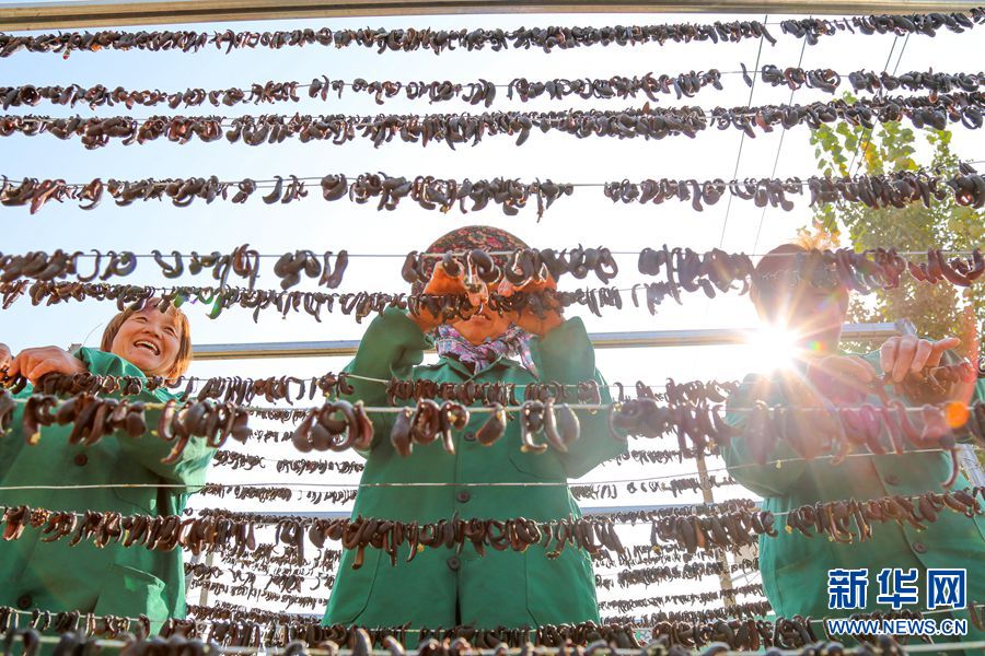 11月10日,河南省洛阳市汝阳县小店镇关帝村水蛭养殖基地,一位员工正在晾晒水蛭。