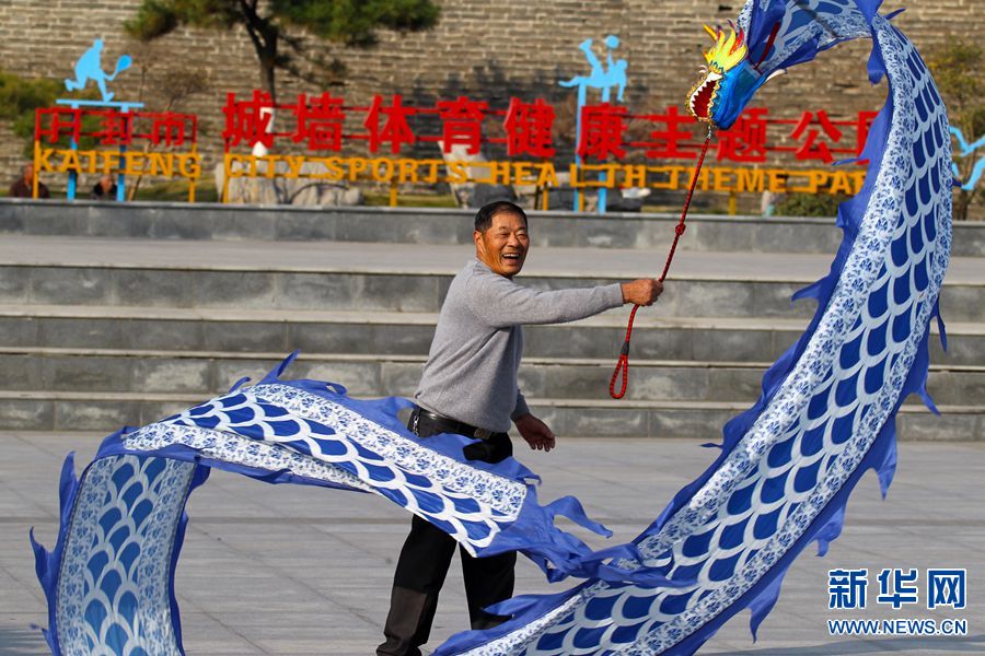 11月12日,河南开封,市民在东护城河畔舞龙健身。