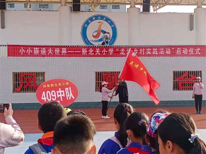 5月11日上午7点,四年级全体师生准时在学校操场集合。涉县新北关小学校长韩海河做了重要讲话,他告诉同学们要珍惜这次实践的机会,听从老师的统一指挥,认真体验劳动人民的辛苦,并确保活动期间的人身安全。随后,他宣布“小旅途大世界——走进乡村实践活动”正式启动,并给级部主任授旗。在老师们的带领下,孩子们乘车前行,大家展示着自己的才艺,车厢里不时地传出孩子们的欢声笑语,大家都期待着这次愉快的旅途。