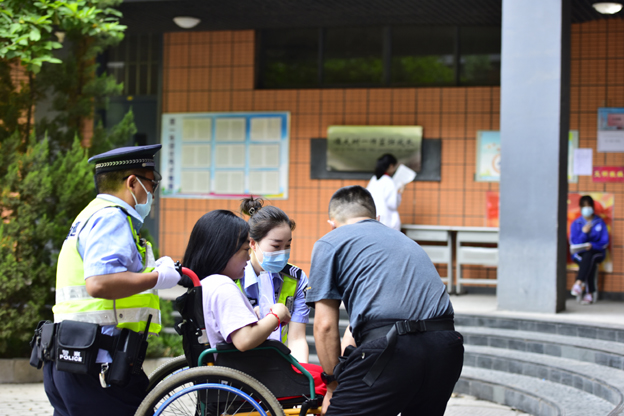 6月8日,邯郸市交巡警开发区一大队民警爱心助考暖人心,合力将受伤坐轮椅的考生护送至考场。