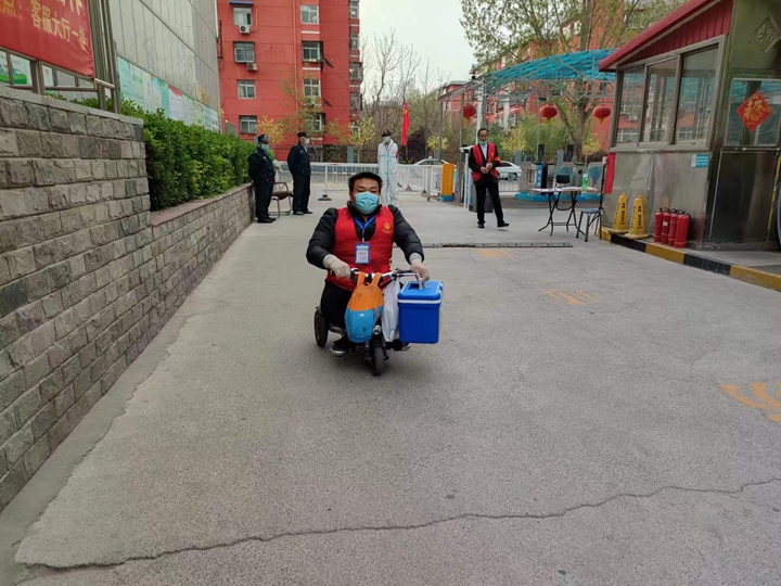 疫情以来,王亮作为社区志愿服务的主力,在疫情防控的各项工作中总能看到他“特殊的身影”。而在这次的主城区封控全员核酸检测期间,他更是忙到一刻不曾停歇。4月8日上午,王亮往返于社区办公室和辖区内各个小区的核酸采集点,为采集点运送棉签、封条等防疫物资。而就是这位声称自己“跑”得快的志愿者,却是一位下肢失去行动能力的残疾人。