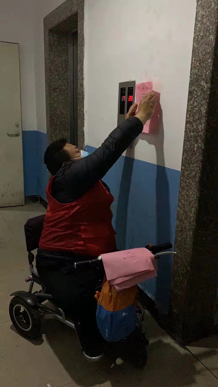 8日晚上,王亮又在社区工作到很晚,帮助社区制作相关通知,而后又骑着他的小车,将通知逐一张贴在各个楼门口。虽然社区里很多地方都设置了无障碍通道,可还是会遇到台阶。“我自己也能搬车,就是麻烦一点,但这些都不是问题,只要能为大家做事情,我心里就觉得高兴。”做志愿者让王亮的内心倍感充实。