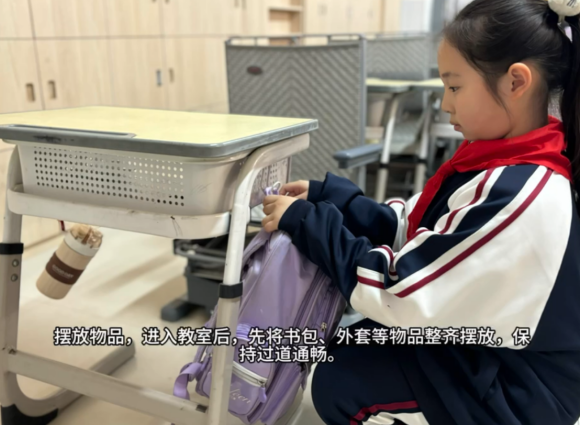 上课铃声响起,同学们自觉排队,步履轻盈地有序步入教室,主动向师生微笑问好。进入教室后,书包外套整齐归位,书本文具统一摆放于课桌左上角,入座时轻拉轻归座椅,交流轻声细语、提问先举手示意,处处彰显文明素养。