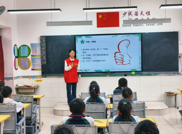 “当你和同学闹别扭时,会有什么感觉?”“怎样说才能让别人明白你的想法?”在心理健康专题宣讲中,志愿者们以贴近儿童生活的趣味案例为切入点,围绕情绪识别、同伴沟通、压力调节三大核心主题,通过“乐观大拇指”互动游戏、情景模拟演练等通俗形式,引导孩子们认识开心、生气、委屈等常见情绪。