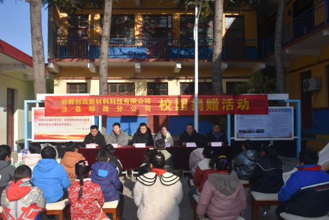 上午10点左右,邯郸创远新材料科技有限公司负责人李泳泳和涉县邮政分公司副总经理曹少英带领相关工作人员携带物资来到青塔小学。学校老师和孩子们对他们的到来表示热烈的欢迎。