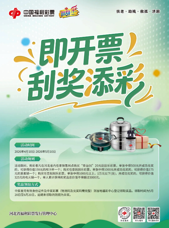 一张小小的彩票,承载的不仅是购彩的乐趣,更凝聚着社会公益的暖流。在此,河北福彩诚邀全省广大购彩者,在活动期间走进身边的福彩销售网点,在奉献爱心、支持公益事业的同时,体验“刮奖添彩”的乐趣,收获一份属于春天的幸运与惊喜。