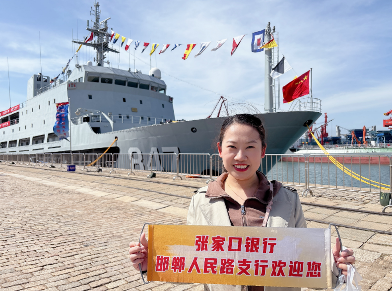 在人民海军成立 77 周年纪念日舰艇开放活动中,张家口银行邯郸人民路支行员工、军嫂张晓华作为军属代表,受邀登上海军阳澄湖舰(舷号 847)参观,近距离感受海军风采,以特殊方式致敬国防事业。
