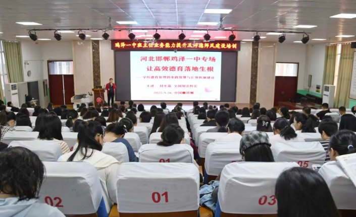 为推进班主任业务能力提升及师德师风建设工作,9月26日上午,鸡泽一中特邀全国知名校长封水高,在南雅报告厅带来专题报告。校长胡贺军,副校长党江丽、徐博雅,校委会成员柴刚亮参加讲座。