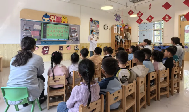 医护人员正为幼儿园老师和孩子们讲解孤独症相关知识,做到早发现、早干预,家庭与校园如何配合开展早期引导。