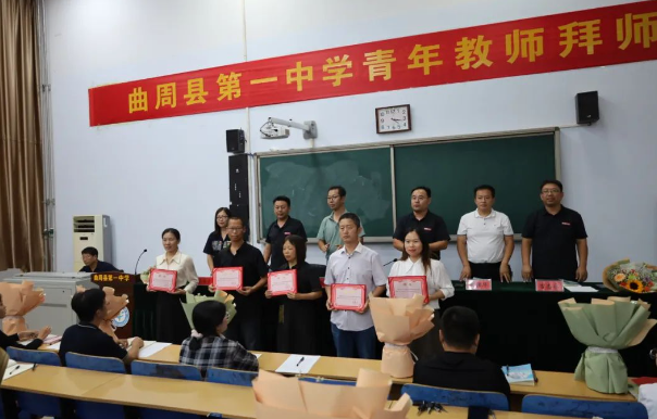 仪式上,师傅代表上台领取聘书,师徒交换协议,随后青年教师向师傅深深鞠躬,并献上了美丽的鲜花。场面温馨,气氛融洽,教育艺术就这样流传在美丽的曲周一中。