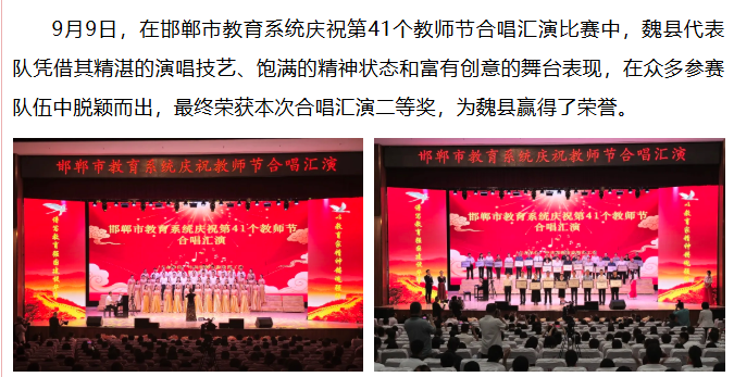 魏县代表队在邯郸市教育系统庆祝第41个教师节合唱汇演中荣获二等奖