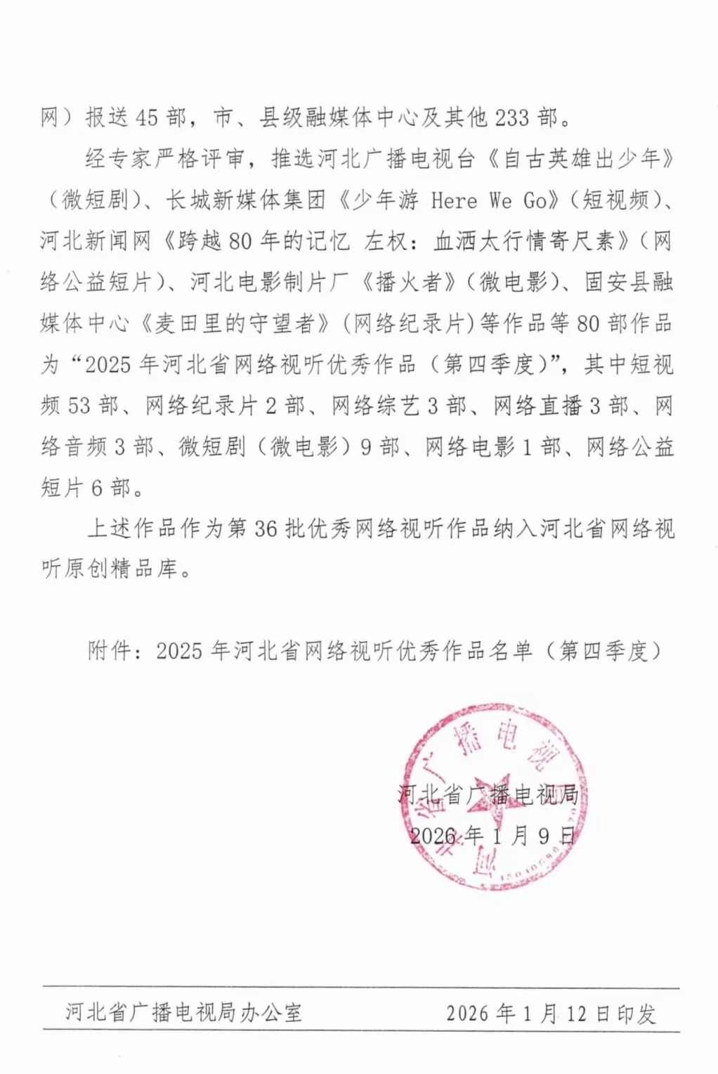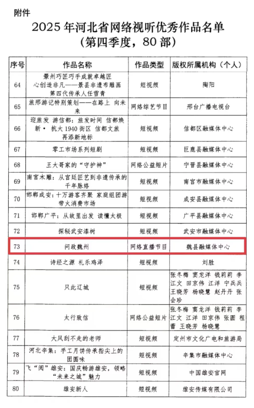 中原新闻网邯郸讯(郭付林 郭海贞)近日,河北省广播电视局正式发布《关于公布2025年第四季度河北省网络视听优秀作品》的通知,经行业专家严格评审、层层筛选,邯郸魏县融媒体中心精心打造的网络直播节目《问政魏州》成功入选优秀作品名单,成为邯郸市县级融媒体中心唯一入选的网络直播类作品,为魏县斩获这份省级荣誉。