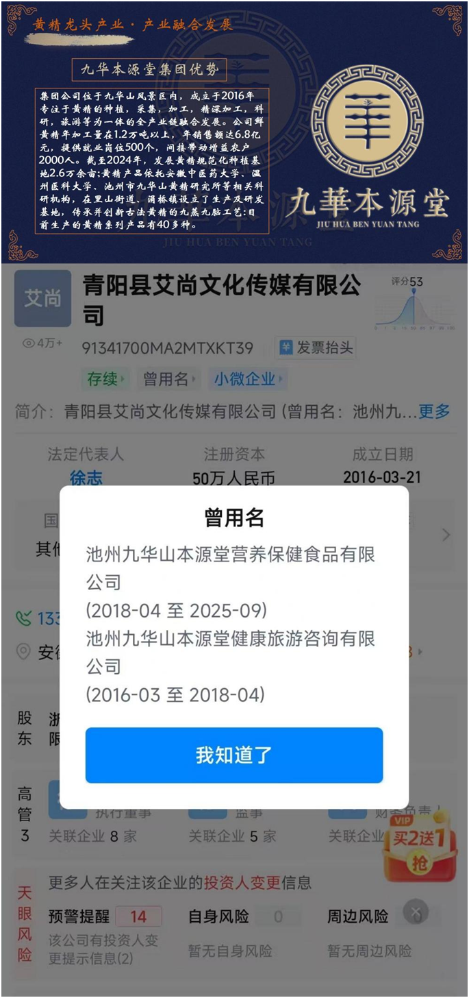 宣传资料显示,九华本源堂集团自称2016年成立于九华山风景区,专注黄精全产业链融合发展,业务覆盖种植、加工、科研、旅游等领域。但天眼查信息揭露,其核心关联主体实为青阳县艾尚文化传媒有限公司,该公司成立于2016年3月,注册资本仅50万元,法定代表人为徐志,曾两次变更名称,从保健食品、健康旅游咨询领域转型文化传媒。2025年9月17日,该公司控股股东由安徽省本源堂生物科技有限公司变更为浙江本源堂生物科技有限公司。