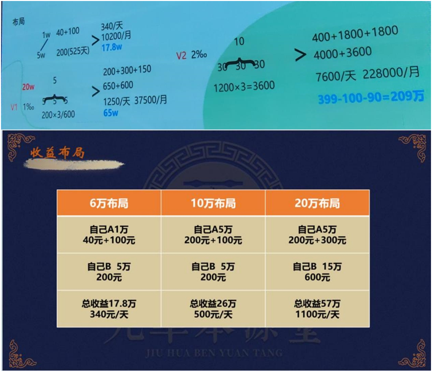 更高额度投资回报更为惊人,投资20万元可升级为V1区级代理,最高回报65万元;投资100万元升级V2县级代理,扣除本金后收益达209万元,且承诺签订保本合同。