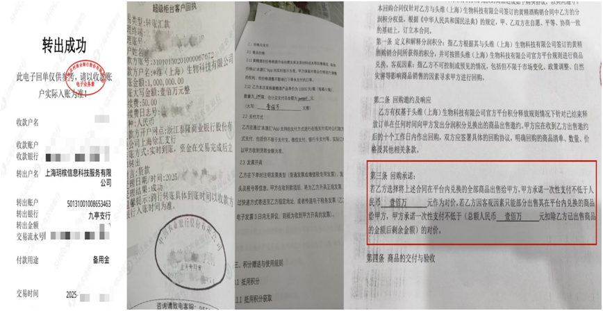 更令人质疑的是,该集团吸收资金时签订的是黄精酒购销合同,资金流入头维(上海)生物科技有限公司账户,但投资人的回款却由上海玥槟信息科技服务有限公司转出,两家公司并无股权关联。这种“收钱与返利主体分离”的架构,被业内质疑存在刻意规避资金监管、转移法律责任的嫌疑。