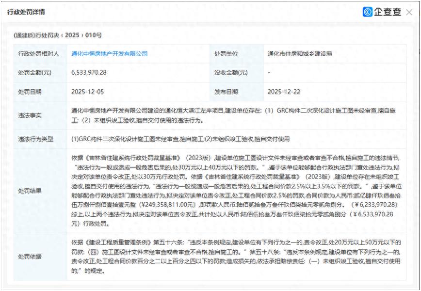2025年12月22日,通化市住房和城乡建设局公布(通建质)行处罚决〔2025〕010号行政处罚决定书,通化中恒房地产开发有限公司因在通恒大滨江左岸项目建设中存在GRC构件二次深化设计施工图未经审查擅自施工、未组织竣工验收擅自交付使用两项违法行为,被责令整改并处罚款653.397028万元,这一案例凸显出房地产开发领域建设程序合规监管的严肃性。