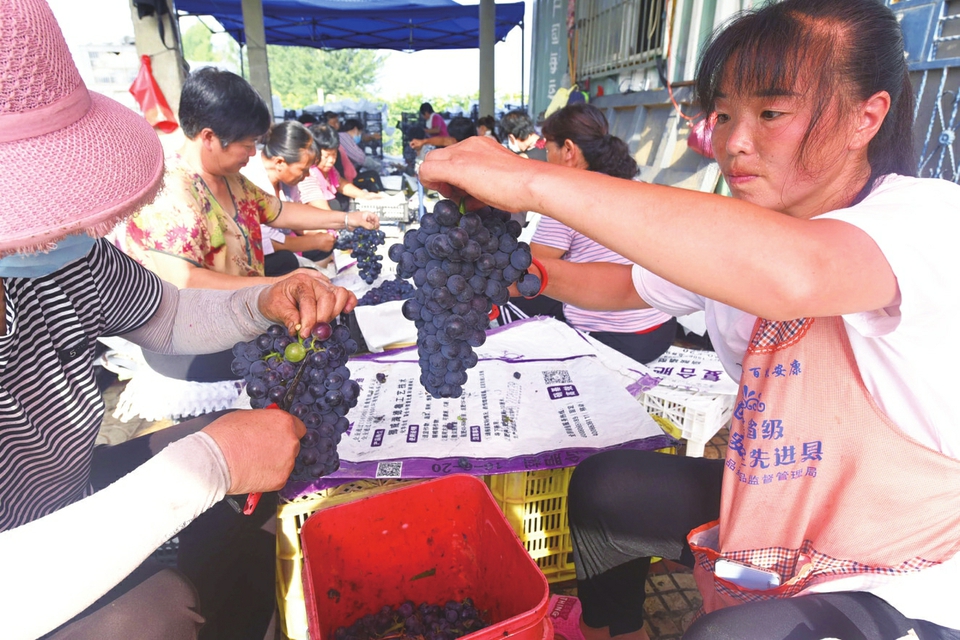 8月3日,阳谷县寿张镇冀王村富兴葡萄种植合作社社员在分拣包装葡萄。 近年来,寿张镇采取转包、出租、股份合作等形式,全力推进土地