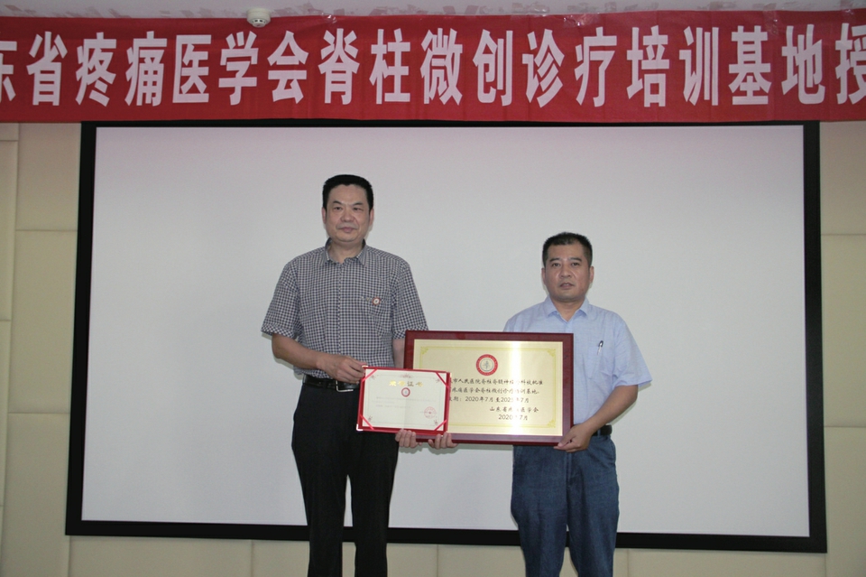 山东省疼痛医学会会长刘玉光(左)向聊城市人民医院脑科医院脊椎脊髓神经外科主任李学元(右)授牌。 7月30日,山东省疼痛医学会脊