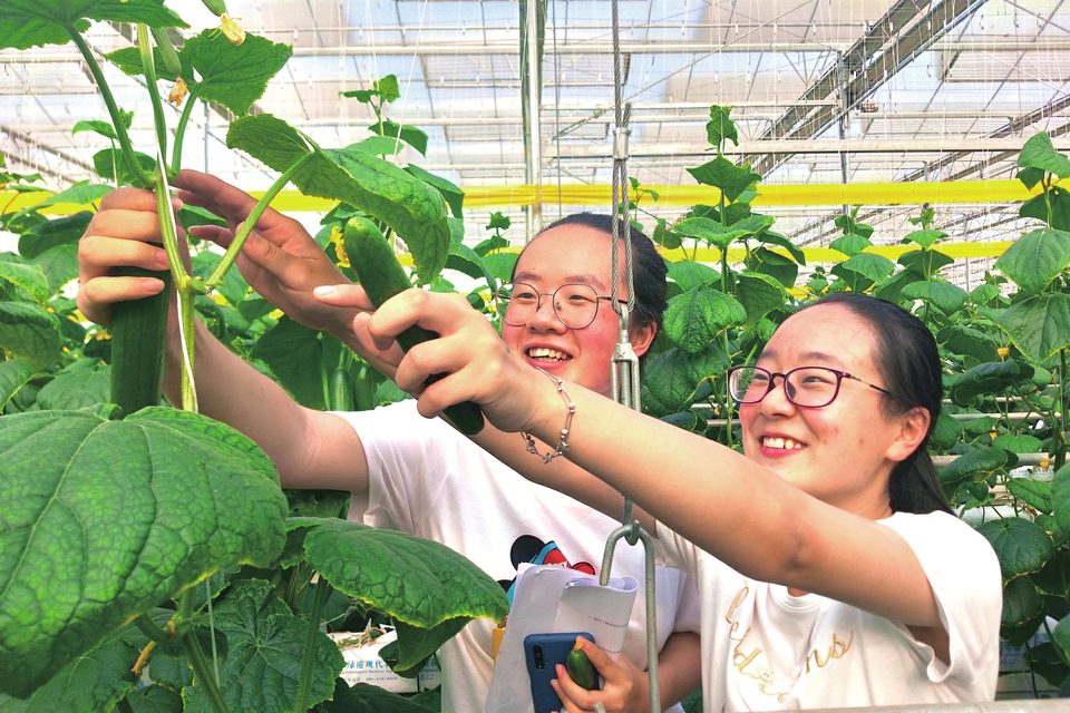 7月16日,在茌平区贾寨镇耿店村绿隆农业科技有限公司智能温室里,大学生甄玉荷(左)、秦泽倩在采摘水果黄瓜。 当日,来自西北