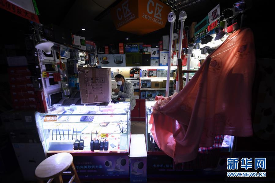2月24日,在深圳华强北暂未完全开放的赛格电子市场里,商户在与客户打电话。 新华社记者 毛思倩 摄